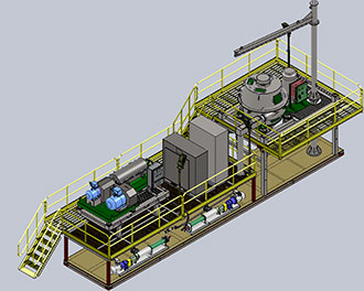 工作時候,將鉆屑甩干機和鉆井液離心機的支架升高到最高處,能夠滿足鉆屑甩干機的鉆屑排放,以及 鉆井液離心機的液相和固相排放,液相的排放可以直接通過重力作用將干凈泥漿流入到儲漿罐或固控系 統中去。